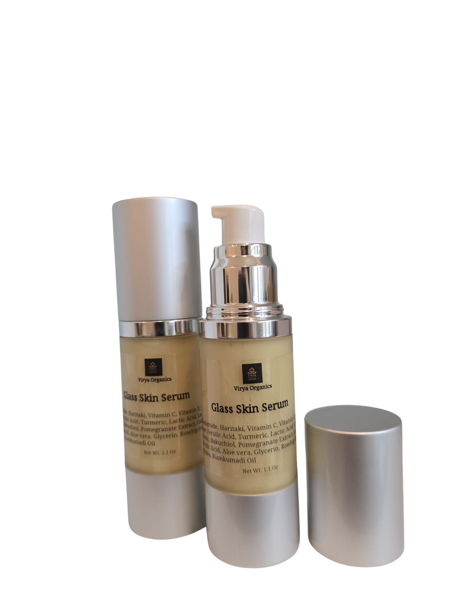 Turmeric, Bakuchiol, Haritaki, Vitamin C, Vitamin E, Witch hazel, Ferulic Acid, Niacinamide, Lactic Acid, Lanolin, Alpha Arbutin, Pomegranate Extract, Caffein, Salicylic Acid, Aloe vera, vegetable Glycerin, Rosehip Oil, Kumkumadi, Collagen Peptides